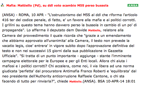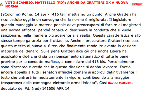 Voto di scambio politico mafioso: missione compiuta.Con la definitiva approvazione dell’AC 4368 le pene previste per il 416 ter passano nel minimo a 6 anni e nel massimo a 12 (ora il minimo è 4, il massimo è 6), in coerenza e proporzione alle già innalzate pene per il 416 bis.Abbiamo così rispettato l’impegno che ci eravamo presi, ma anche le indicazioni della Corte Costituzionale. Così abbiamo compiuto il percorso iniziato nel 2013.Il vecchio 416 ter, introdotto nel 1992, per oltre 20 anni non era servito quasi a niente. Il nuovo 416 ter anticipa il momento della commissione del reato allo scambio delle le promesse e amplia le condotte perseguibili alle “altre utilità”. Punisce quindi duramente il politico che cerchi il sostegno della mafia in campagna elettorale, ma punisce autonomamente il mafioso che si presta allo scambio. Una pena grave, ma necessaria a rimarcare che la mafia non avrebbe la forza che ha senza l’interlocuzione con la politica e quindi il politico che cerchi il suo sostegno, contribuendo a legittimarla socialmente, ne perpetra la sopravvivenza.Rispetto alle parole “mediante le modalità di cui al terzo comma dell’articolo 416 bis” che hanno creato qualche incertezza, sono state di conforto le più recenti parole del PNAA, Franco Roberti: “Dopo un iniziale periodo di rodaggio della nuova versione dell’articolo 416 ter, la nuova giurisprudenza della Cassazione si è assestata su una interpretazione che secondo me rende questa norma applicabile, agibile, e quindi c’è uno strumento in più per contrastare le connessioni politico-mafiose che sono come sappiamo tutti la vera forza delle mafie”
