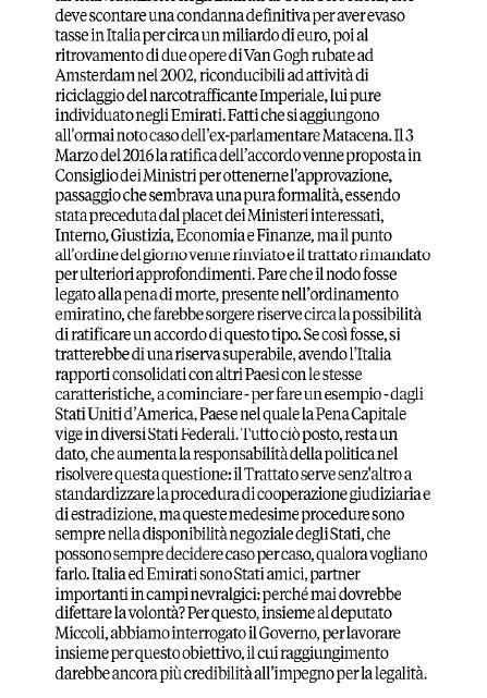 (ANSA) - Sempre più urgente il trattato di cooperazione giudiziaria tra Italia ed Emirati: oggi pomeriggio il Consiglio dei Ministri ha un’altra opportunità. Il pre-trattato è del 16 settembre del 2015, i pareri dei Ministeri coinvolti sono stati espressi positivamente, manca il passaggio al CdM, preludio alla ratifica parlamentare. Ieri abbiamo appreso di una nuova importante operazione contro la criminalità organizzata coordinata dalla DDA di Napoli, che ha cooperato con le autorità spagnole e che ha portato all’arresto di 11 persone coinvolte nel traffico internazionale di droga e nel riciclaggio. Sono state individuate anche alcune società frutto dell’attività di riciclaggio site, tra l’altro, proprio a Dubai. L’intelligence italiana segnala da anni la presenza a Dubai di personaggi legati alla camorra, oltre che alla ‘ndrangheta. Non c’è dubbio che per molti motivi gli emirati Arabi siano scelti da delinquenti italiani per fare affari e stare latitanti: è prioritario rendere operativo il trattato di cooperazione giudiziaria, lo dobbiamo soprattutto a chi sul campo quotidianamente è impegnato nel corpo a corpo con i malviventi. Intanto domani a Reggio Calabria sarà celebrata una nuova udienza del processo Breackfast: sullo sfondo la perdurante latitanza di Matacena, dall’Agosto del 2013"